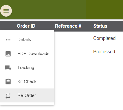 3.) With the list of orders up and viewable, click on the circle with the 3 lines next to the order that you will want to create the "Kit Check" against and select Kit Check.