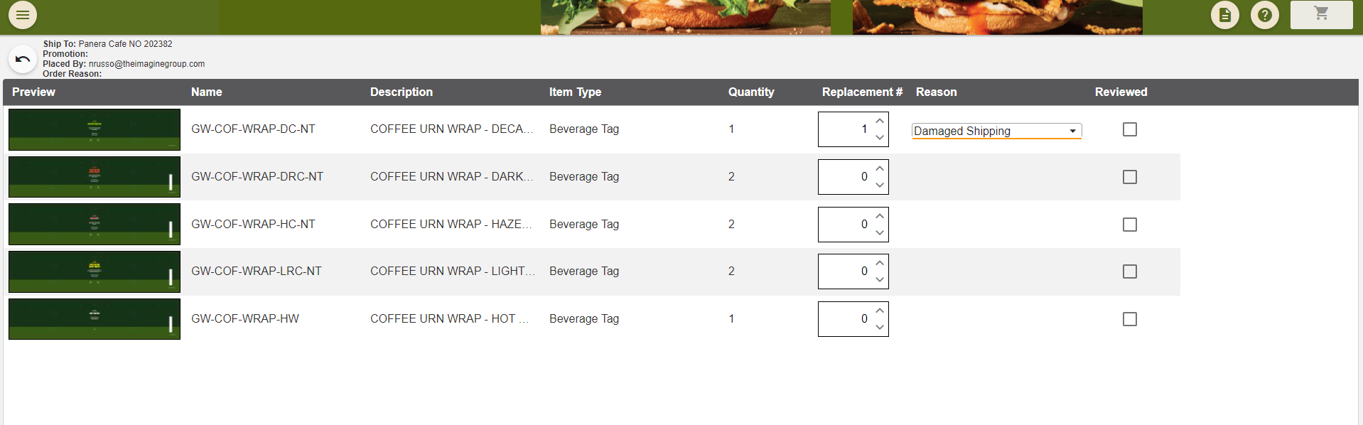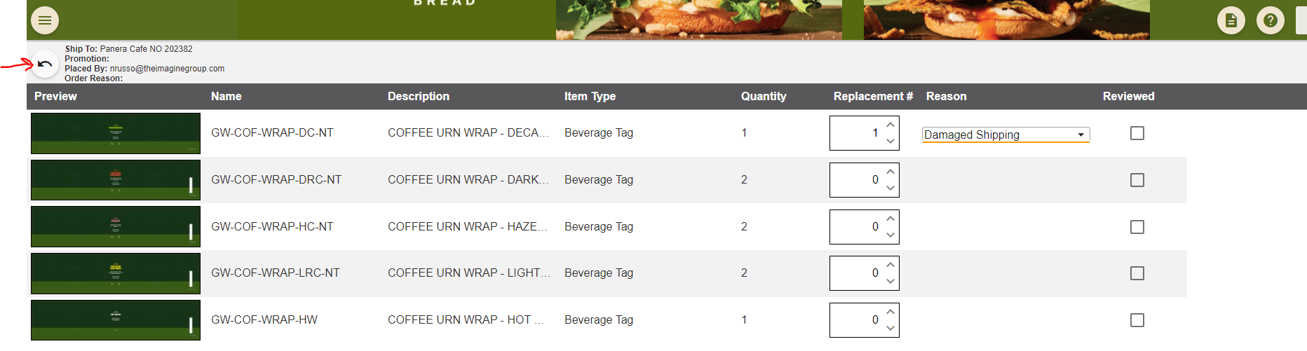 5.) This will provide a list of all items against or on the order. For replacements you will need to fill out the Replacement # column for the item that needs to be replaced as well as the Reason column. All items that are to be replaced MUST have a reason associated to it.